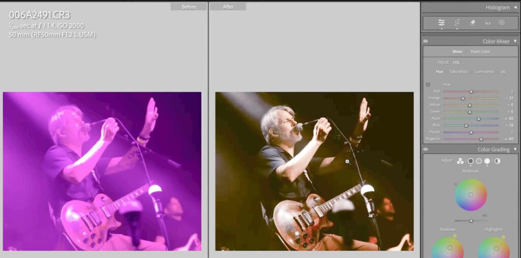His work recently drew Adobe’s attention through a Twitter post showing before/after results on difficult concert lighting. Instead of defaulting to black‑and‑white, he used Lightroom Classic to recover the photo’s natural colors, demonstrating both technical expertise and a careful approach to editing.